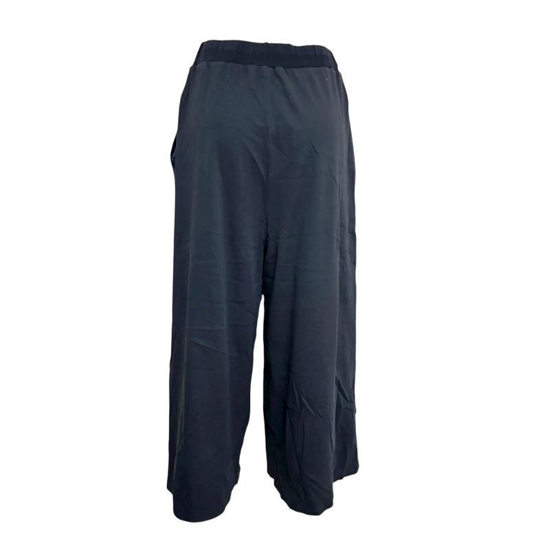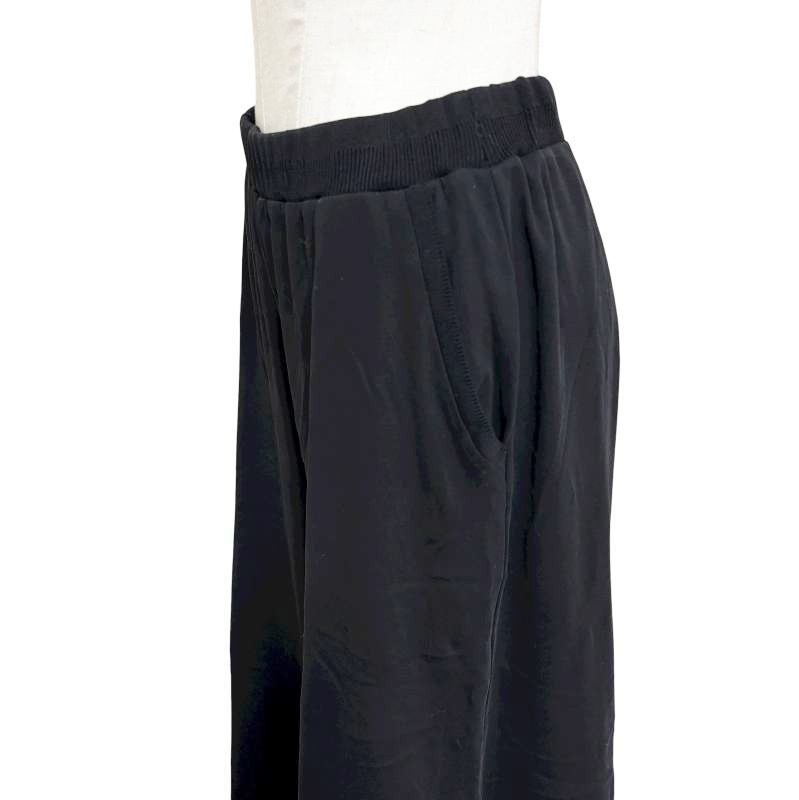 ウエストはゴム仕様で、快適な履き心地と調整しやすさが魅力です。シンプルな黒無地デザインで、オフィスカジュアルから普段のお出かけまで幅広く活躍します。ゆったりとしたワイドシルエットが体型カバーにもなり、動きやすくリラックス感のある着用感です。素材感はしなやかで軽く、季節を問わず着回しやすい一枚です。状態は非常に良好で、汚れや傷はなく、使用感もほとんど感じられない美品です。洗練されたシンプルデザインで長くお使いいただけます。