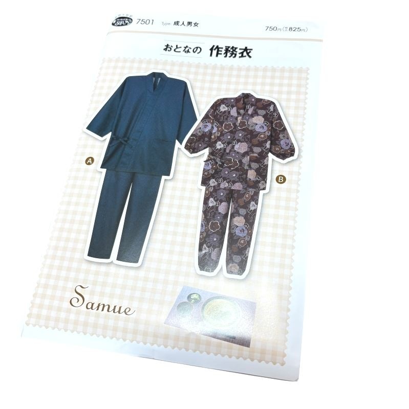 新品です。定価750円。男女兼用で使える作務衣の型紙です。和の雰囲気を大切にしつつ、洋裁・和裁どちらにも対応できる実用的なデザイン。上着とパンツのセットを作ることができ、家庭用ミシンでも仕立てやすい構成になっています。ゆったりとしたシルエットで動きやすく、部屋着や作業着、リラックスウェアとしても人気の型紙です。布地の種類によって季節を問わず楽しめるのも魅力。状態は汚れや折れ、書き込みもなく非常にきれいな美品です。使用頻度が少なく、保管状態も良好なため、これから作務衣づくりを始める方にもおすすめの一品です。