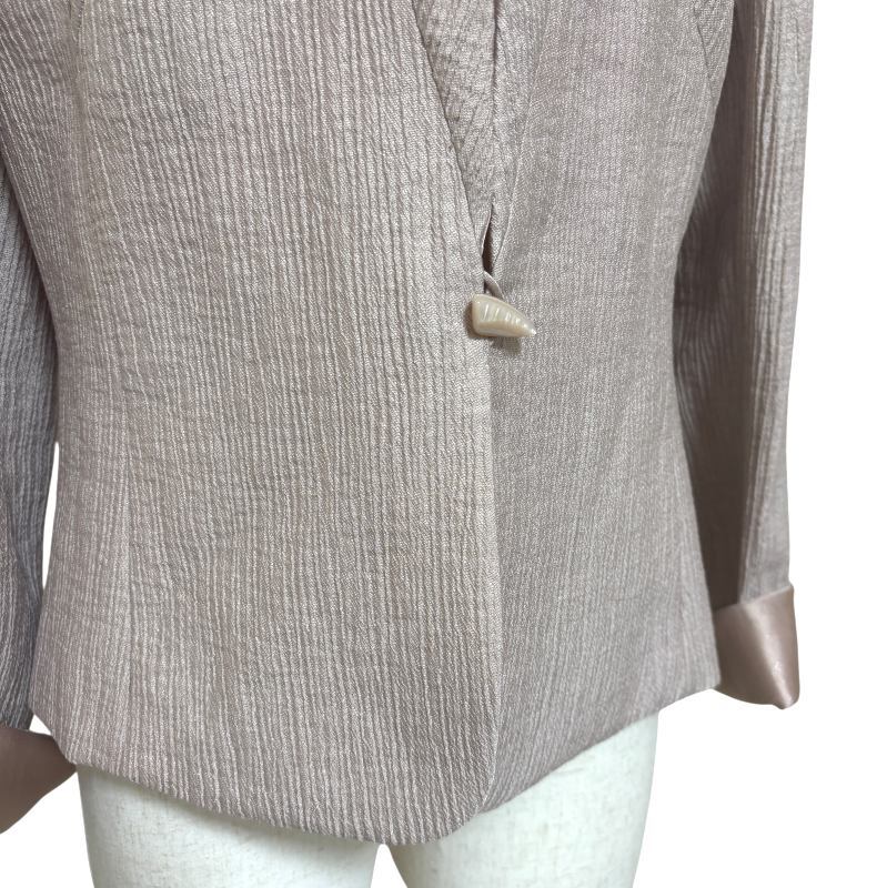 東京ソワールの上位ライン「ドルチェ」より、華やかなピンクのフォーマルジャケットです。上品なラメ糸が織り込まれた生地が、光の角度によってさりげなく輝き、華やかでありながら気品のある印象を演出します。ノーカラーのすっきりとしたデザインで、ワンピースやブラウスとの相性も抜群。入卒式や結婚式、パーティーなどのフォーマルシーンにぴったりの一着です。9号サイズで女性らしいシルエットを美しく見せてくれます。汚れや傷はなく、使用頻度の少ない美品で、全体的にとてもきれいな状態です。上質感と華やかさを兼ね備えたおすすめのフォーマルジャケットです。シャイニーなサテン素材のジャケット。襟にラメ入り。シワ加工されたシルクタッチのシャンタン素材。裏地あり。