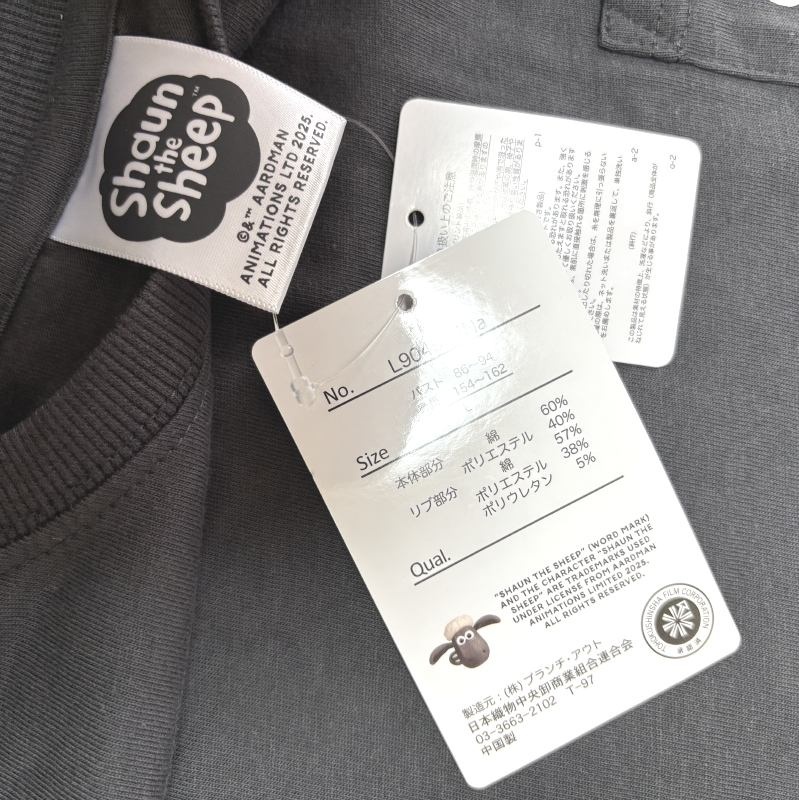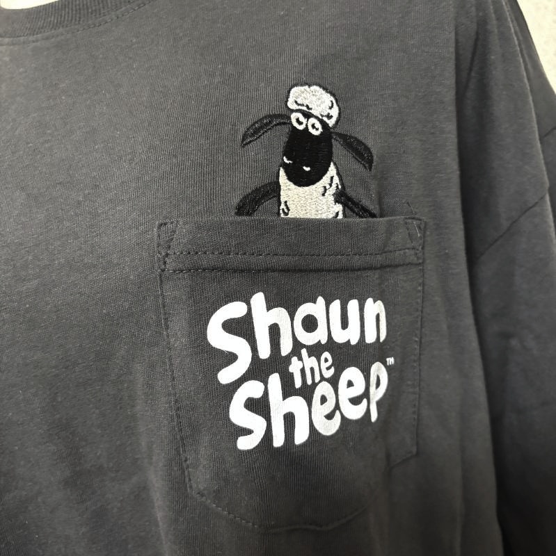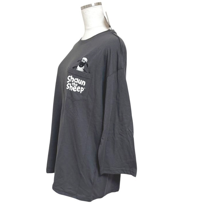 タグ付き新品。ひつじのショーンをモチーフにしたレディース長袖Tシャツ(カットソー)です。落ち着いたダークグレーで、キャラクターの刺繍デザインがさりげなく可愛らしさをプラス。柔らかく伸縮性のある素材で、着心地も快透け感なし。