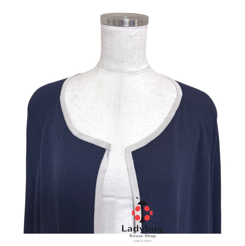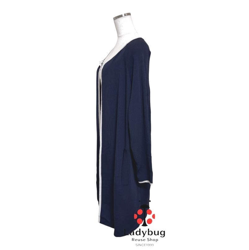 毛羽立ちなどなく美品。落ち着いたネイビーカラーが上品な、ロング丈のボタンレスニットカーディガンです。しなやかで柔らかな素材感が魅力で、体に自然に沿うシルエットが女性らしさを演出。軽く羽織るだけでコーディネートにアクセントを加え、オフィスからカジュアルまで幅広く活躍します。使用感はほとんどなく、汚れや傷もない美品で、快適な着心地を保っています。季節の変わり目や冷房対策にもおすすめの一枚です。ホワイトのトリミングが清楚なボタンレスのニットカーディガン。シンプルでオケーションにも使えます。オールシーズン使えるレーヨンニットでとてもよく伸縮し着心地がよいです。ゆったりしています。透け感なし。ポケットあり。裏地なし。◆サイズ◆M バスト124 ゆき丈72 着丈83
