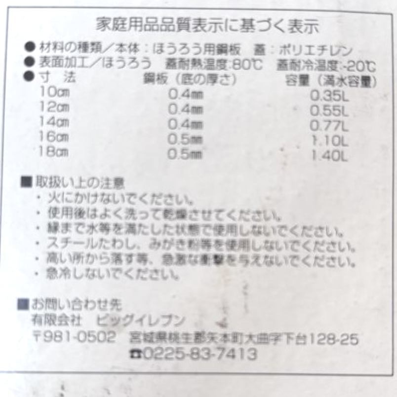 ◆サイズ◆ 10cm(0.35リットル) 12cm(0.55リットル) 14cm(0.77リットル) 16cm(1.1リットル) 18cm(1.4リットル)