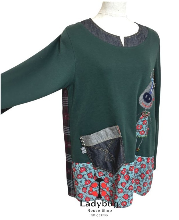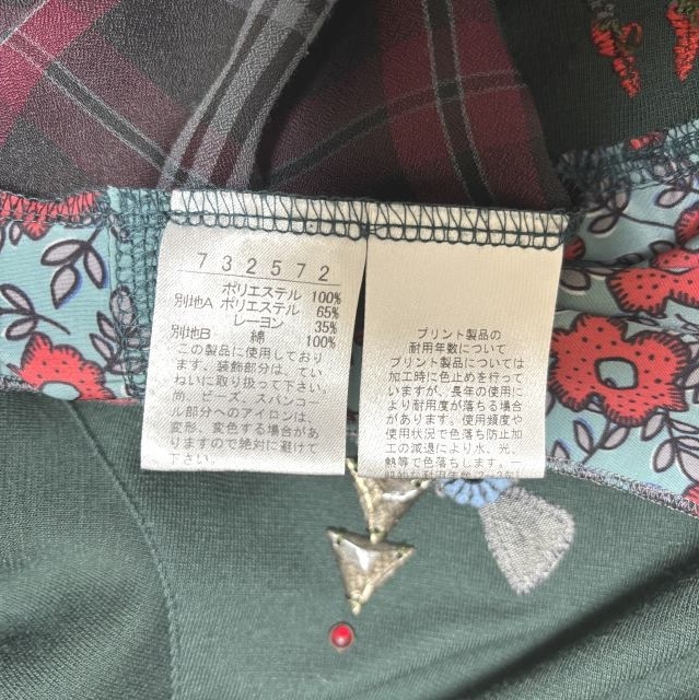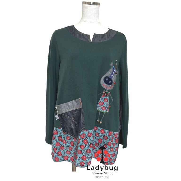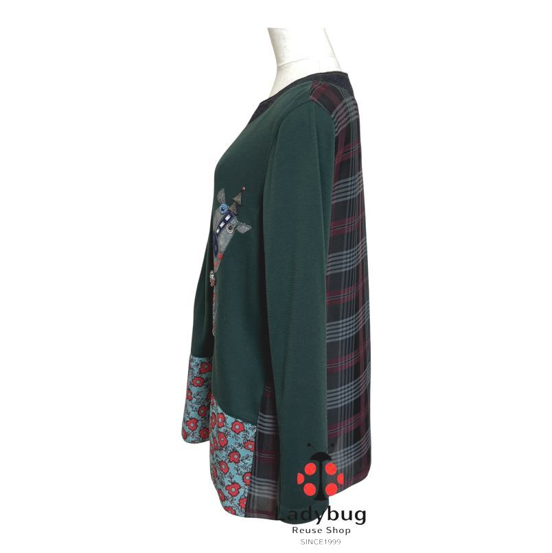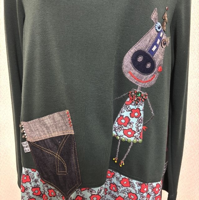 アルベロベロ 長袖カットソー Aライン ロバワッペン スウェット デニム シフォン 切り替え モスグリーン チェック ブラック [mbtl-2181]