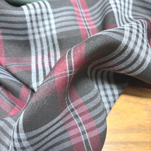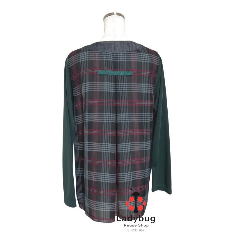 スウェット・デニム・シフォンの切り替えが特徴的で、モスグリーンとブラックのチェック柄がおしゃれです。