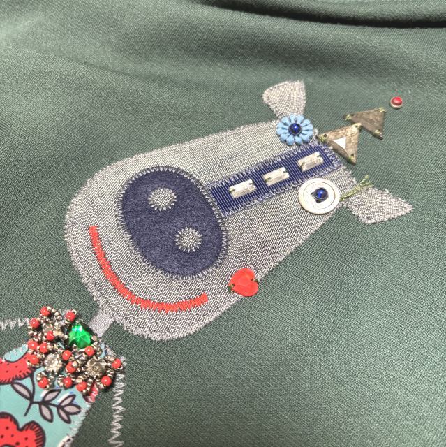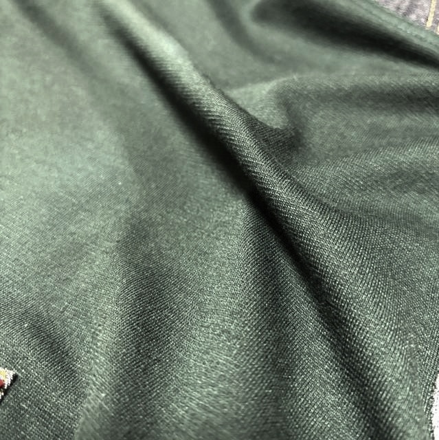 襟ぐりはブラックデニム、前はやわらかなモスグリーンの
