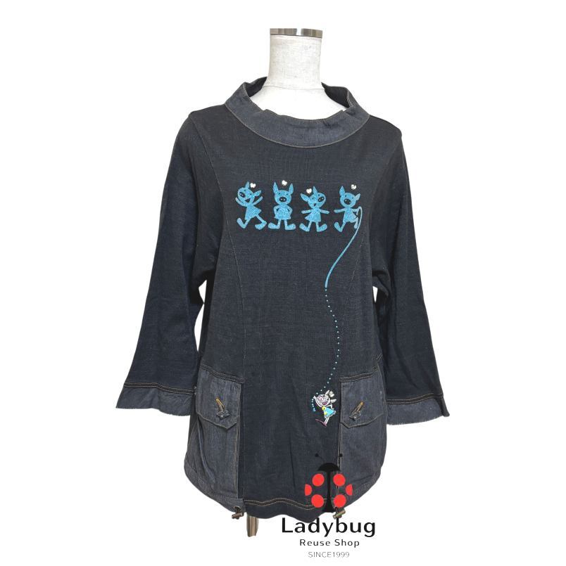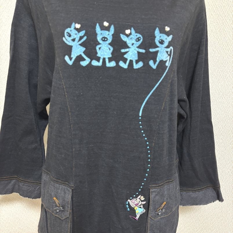 アルベロベロ 7分袖 ニットカットソー 4匹のブタワッペン カメラのボタン デニム切り替え ブラック ポケット付き [mbtl-2182]