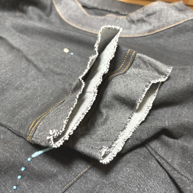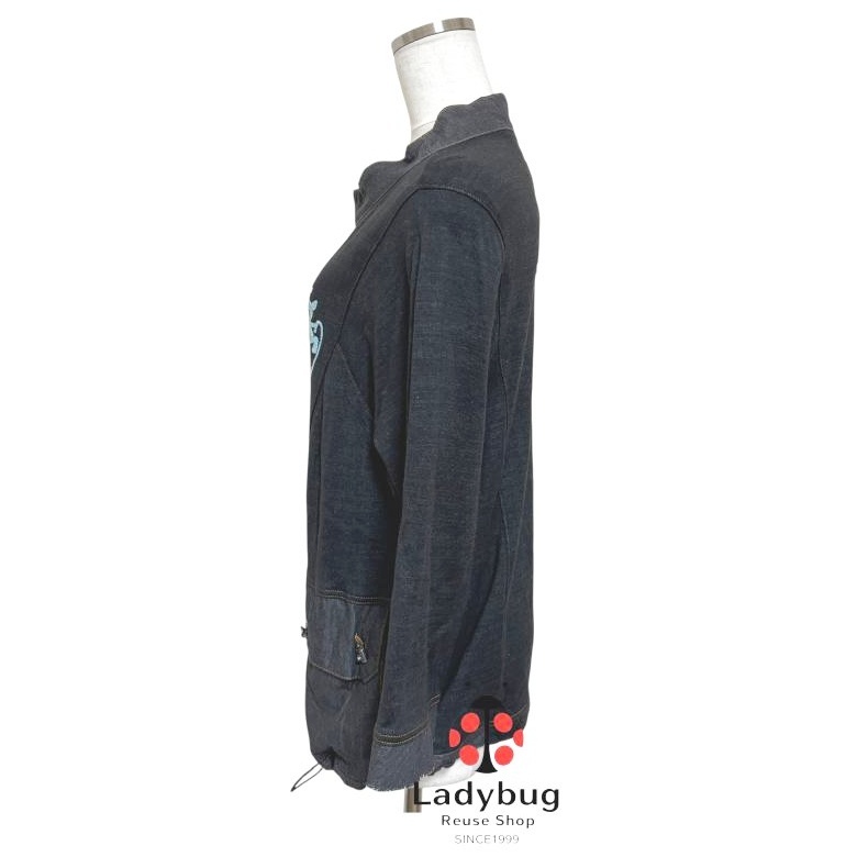 デニム切り替えが特徴的で、ブラックカラーにポケット付きで実用性もあります。