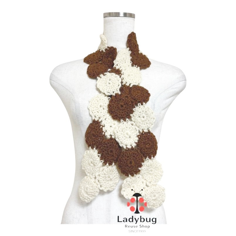 ハンドメイド かぎ針編み ニットマフラー 花モチーフ 襟巻き オフホワイト ダークブラウン