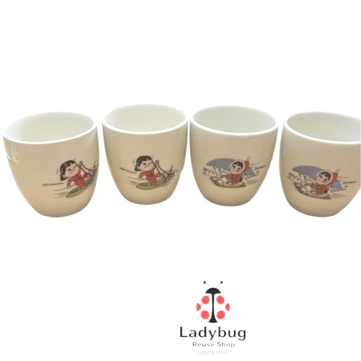 不二家 昔のフリーカップ 4個セット 中古 ぺこちゃん スキー そり レトロ [z-3983]