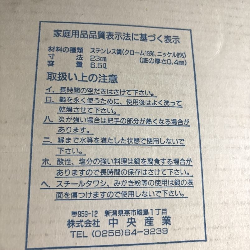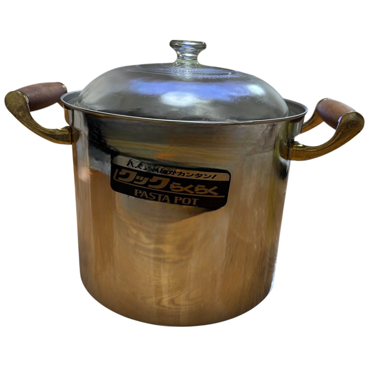 新品です。ステンレス製のパスタポット23cm、容量6.5リットルの大容量鍋です。蒸し器付きで茹で料理や蒸し料理、煮込み料理にも活躍。持ち手に画像のとおりさびはありますが、まだまだ使用可能な昭和平成レトロの調理器具。家庭用にも業務用にもおすすめです。パイレックスのガラス蓋付き。